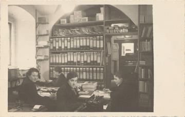 Illustrierte Postkarte; Fotografie, monochrom Rückseite: männliche und weibliche Mitarbeiter in einem Büro Vorderseite: beschrieben; adressiert an Familia Llauro, Basel