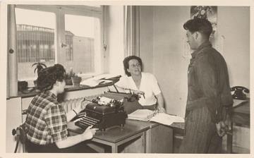 Illustrierte Postkarte; Fotografie, monochrom Rückseite: drei Frauen und ein Junge in einem Büro, Tisch mit Schreibmaschine Vorderseite nicht beschrieben