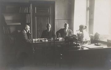 Illustrierte Postkarte; Fotografie, monochrom Rückseite: drei Männer neben Sekretärin mit Schreibmaschine, Tisch mit Unterlagen (Firmendruck Osram) Vorderseite nicht beschrieben