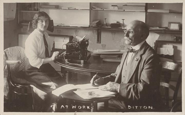 Illustrierte Postkarte; Fotografie, monochrom Rückseite: Mitarbeiter/Vorgesetzter (mit Kravattenschleife) und Sekretärin (mit Haarschleife) in einem Büro, Tisch mit Schreibmaschine Vorderseite nicht beschrieben