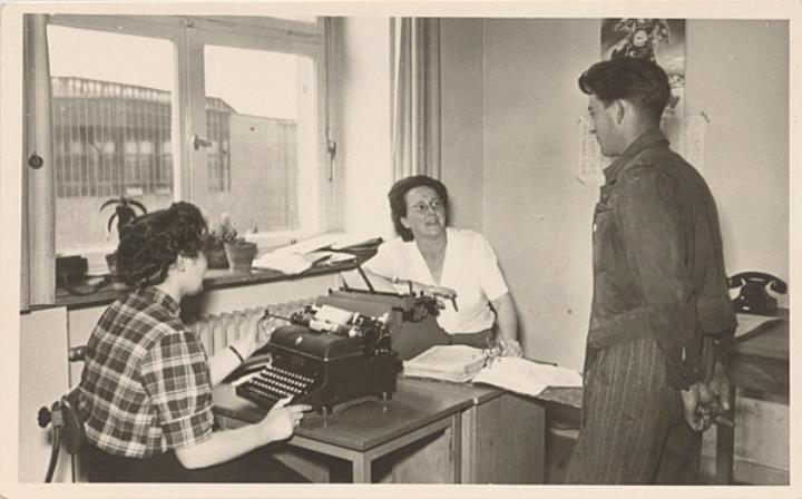 Illustrierte Postkarte; Fotografie, monochrom Rückseite: Büroansicht; zwei Mitarbeiterinnen mit Schreibmaschine, ein Mann stehend Vorderseite mit Fotografenstempel