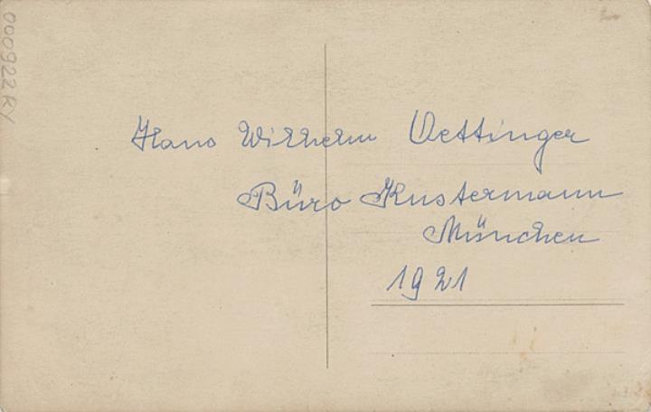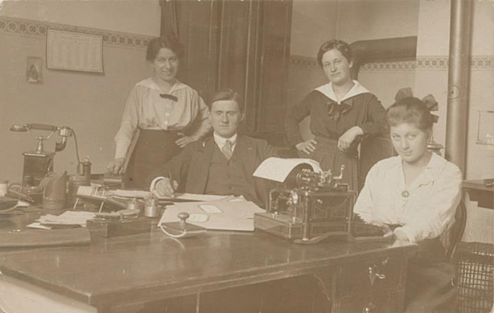 Illustrierte Postkarte; Fotografie, monochrom Rückseite: Büroansicht; Vorgesetzter und drei Mitarbeiterinnen posieren für ein Gruppenbild, Tisch mit Schreibmaschine und Telefon Vorderseite beschrieben: [...] Büro Kustermann München 1921