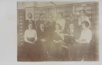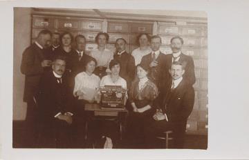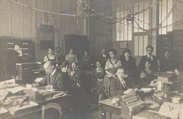 Illustrierte Postkarte; Fotografie, monochrom Rückseite: Büroansicht; männliche und weibliche Mitarbeiter posieren für ein Gruppenbild, Büro mit Girlanden dekoriert Vorderseite: beschrieben; datiert 07.01.1919