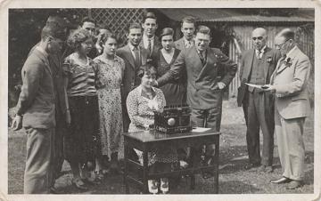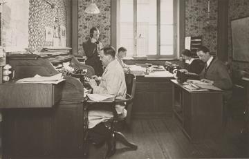 Illustrierte Postkarte; Fotografie, monochrom Rückseite: männliche und weibliche Mitarbeiter mit Schreibmaschinen und Telefon in einem Büro Vorderseite mit handschriftlichem Vermerk: 1935
