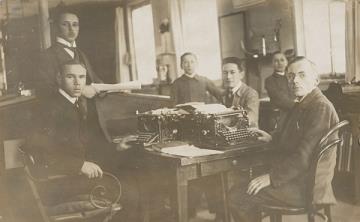 Illustrierte Postkarte; Fotografie, monochrom Rückseite: Büroansicht; vier Mitarbeiter mit Schreibmaschine und zwei Bürojungen posieren für ein Gruppenbild Vorderseite nicht beschrieben
