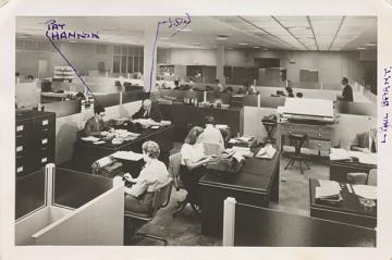 Illustrierte Postkarte; Fotografie, monochrom Rückseite: Großraumbüro mit weiblichen und männlichen Mitarbeitern bei der Arbeit; drei Mitarbeiter handschriftlich mit Namen markiert Vorderseite mit handschriftlichem Vermerk: Late 1959 [...]