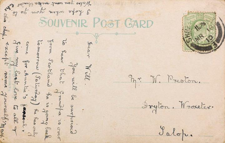 Illustrierte Postkarte; Grafik, polychrom; Valentines Series Rückseite: Mann mit kaputter Schreibmaschine, daneben ein Ziegebock Vorderseite: beschrieben; adressiert an Mr Preston, Salop; Briefmarke Postage Revenue (U.K.) Half Penny; Poststempel Mr 18 1910