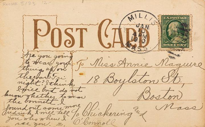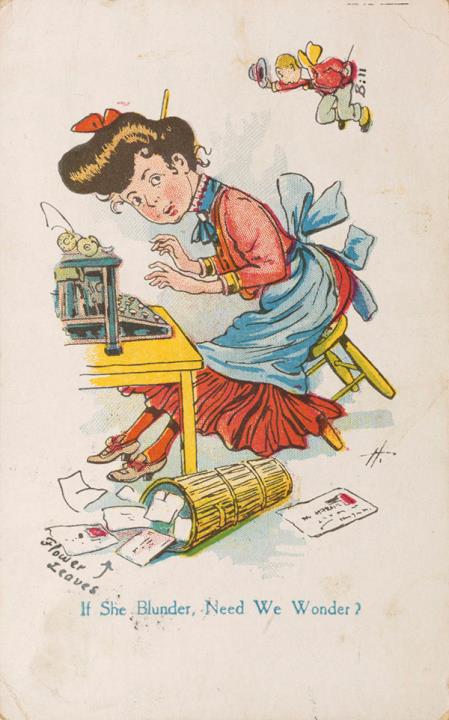 Illustrierte Postkarte; Grafik, polychrom; Grafik: Bill Rückseite: Sekretärin mit Schreibmaschine, darüber ein fliegender Elf Vorderseite: beschrieben; adressiert an Miss Maguire, Boston; Briefmarke U.S. Postage One Cent; Poststempel Millis/Jan 10 1910