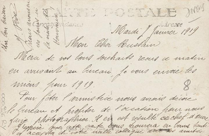 Illustrierte Postkarte; Fotografie, monochrom Rückseite: Büroansicht; männliche und weibliche Mitarbeiter posieren für ein Gruppenbild, Büro mit Girlanden dekoriert Vorderseite: beschrieben; datiert 07.01.1919