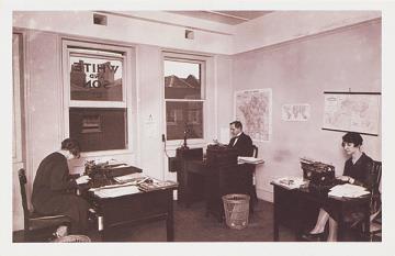 Illustrierte Postkarte; Nachdruck einer Fotografie von 1927, monochrom; Nostalgia Postcard Set 33 Rückseite: Mitarbeiter/Vorgesetzter und zwei Sekretärinnen mit Schreibmaschine in einem Büro Vorderseite mit Beschreibungstext