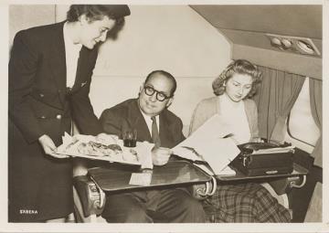 Werbepostkarte; Fotografie, monochrom Rückseite: Geschäftsmann und Sekretärin mit Schreibmaschine in einem Flugzeug der Fluggesellschaft Sabena, eine Stewardess serviert Essen Vorderseite: beschrieben; adressiert an Mademoiselle Verstraeten, Woluwé