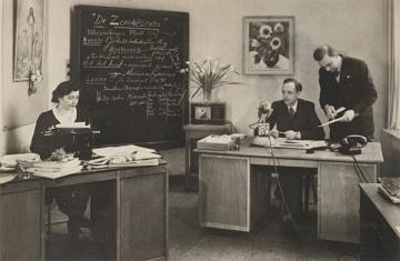 Illustrierte Postkarte; Fotografie, monochrom Rückseite: männliche und weibliche Mitarbeiter von Radio Ziekenbezoek im Büro der Hilfsorganisation "De Zonnebloem" Vorderseite: mit Schreibmaschine beschrieben und adressiert, signiert; Freistempel datiert 1.9.1948, Wert Nederland 6 Cent