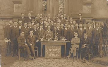 Illustrierte Postkarte; Fotografie, monochrom Rückseite: Aufnahme im Freien; Lehrer und Schüler eines Funkerlehrganges posieren für ein Gruppenbild, in der Mitte Tisch mit Telegrafen und Schild "1919/1922 III Kurs" Vorderseite beschrieben
