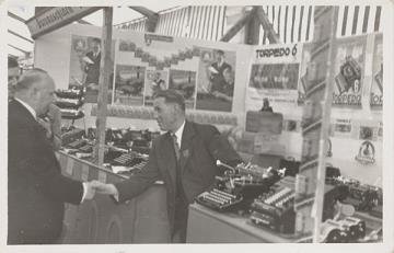Illustrierte Postkarte; Fotografie, monochrom; Nr. 64368 Rückseite: Aussteller und Besucher begrüßen sich vor einem Messestand für Büromaschinen, im Hintergrund Werbeplakate Torpedo Vorderseite mit Vermerk: Österreich/Amstetten 1937