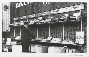 Illustrierte Postkarte; Fotografie, monochrom Rückseite: Mann vor Ausstellungsregalen mit Schreibmaschinen Vorderseite nicht beschrieben