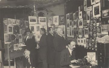 Illustrierte Postkarte; Fotografie, monochrom Rückseite: Besucher einer Fotoausstellung/Auktion begutachten die gehängten Werke; an einem Tisch sitzend ein Mann mit Schreibmaschine Vorderseite nicht beschrieben