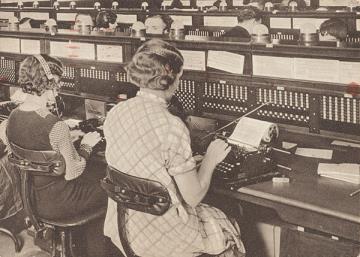 Illustrierte Postkarte; Fotografie, monochrom Rückseite: Büroansicht; weibliche/männliche Mitarbeiter mit Kopfhörer und Schreibmaschine bei der Niederschrift telefonischer Telegramme Vorderseite mit vorgedrucktem Text; adressiert; Freistempel London/27 Oct 1936