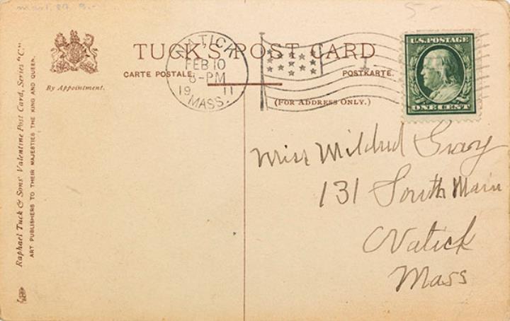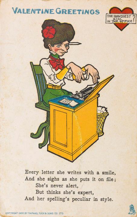 Illustrierte Postkarte; Grafik, polychrom copyright 1906 Raphael Tuck & Sons Co. Rückseite: Sekretärin mit Schreibmaschine, darunter Text in Versform Vorderseite: adressiert an Miss Gray, Natick; Briefmarke U.S. Postage One Cent; Poststempel Natick/Feb 10 1911