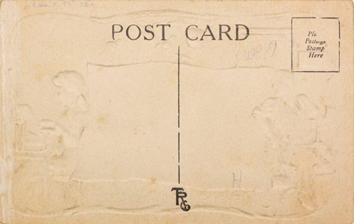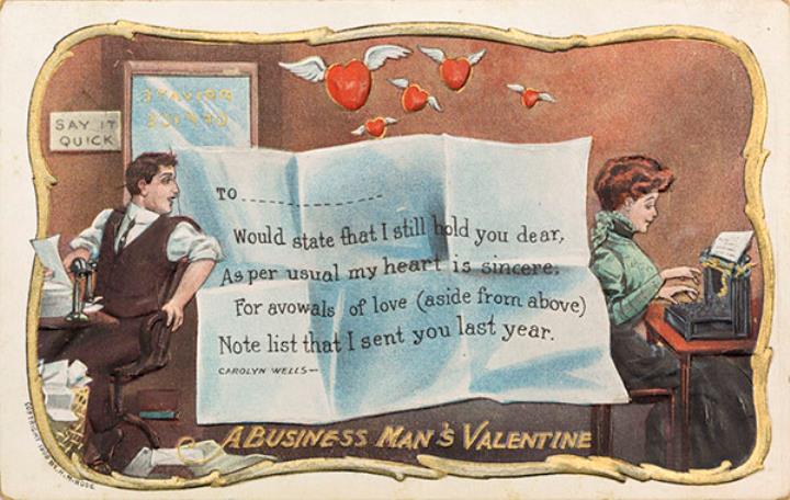Illustrierte Postkarte; Grafik, polychrom; copyright 1909 H. M. Rose Rückseite: Büroszene; Mitarbeiter und Sekretärin mit Schreibmaschine, Briefblatt mit Gedicht, darüber geflügelte Herzen Vorderseite nicht beschrieben