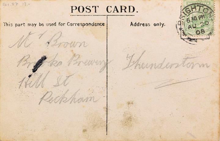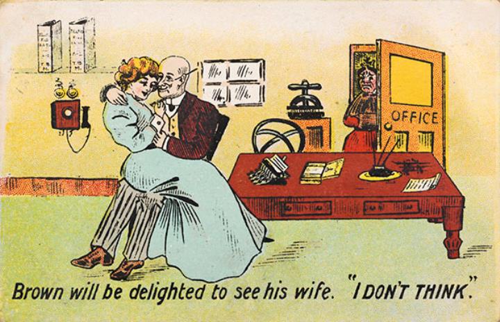 Illustrierte Postkarte; Grafik, polychrom Rückseite: Büroszene; Sekretärin und Vorgesetzter als Paar, Ehefrau betritt das Büro Vorderseite: adressiert an Mr. Brown, Peckham; Briefmarke Postage Revenue (U.K.) Half Penny; Poststempel Brighton/Au 20 1906