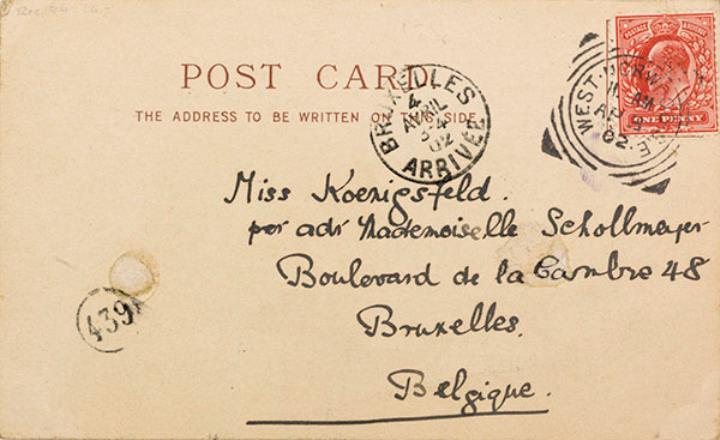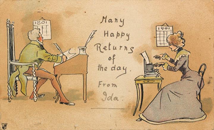 Illustrierte Postkarte; Grafik, polychrom Rückseite: Mann am Schreibpult (Kalender 1801), Sekretärin mit Schreibmaschine (Kalender 1901); Leerraum beschrieben Vorderseite: adressiert an Miss Koenigsfeld, Bruxelles; Briefmarke Postage Revenue (U.K.) One Penny; Poststempel West Norwood/Ap 3 1902, Bruxelles/4 Avril 1902