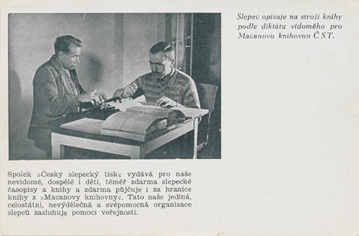 Illustrierte Postkarte; Fotografie, monochrom Rückseite: zwei Männer beim Diktat mit Blindenschreibmaschine; Erläuterungtext (Tschechischer Verein für Blindprägedruck und Blindendruckerei) Vorderseite nicht beschrieben