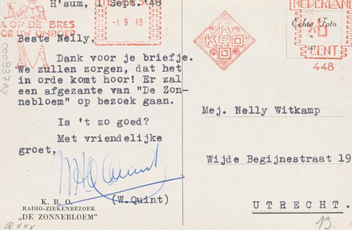 Illustrierte Postkarte; Fotografie, monochrom Rückseite: männliche und weibliche Mitarbeiter von Radio Ziekenbezoek im Büro der Hilfsorganisation "De Zonnebloem" Vorderseite: mit Schreibmaschine beschrieben und adressiert, signiert; Freistempel datiert 1.9.1948, Wert Nederland 6 Cent