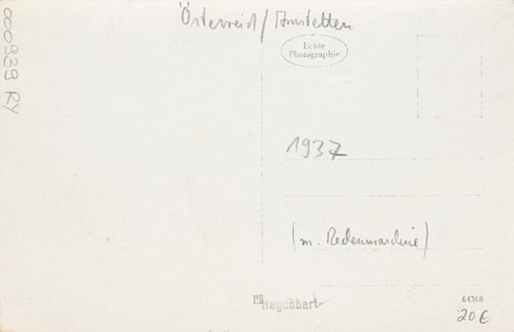 Illustrierte Postkarte; Fotografie, monochrom; Nr. 64368 Rückseite: Aussteller und Besucher begrüßen sich vor einem Messestand für Büromaschinen, im Hintergrund Werbeplakate Torpedo Vorderseite mit Vermerk: Österreich/Amstetten 1937