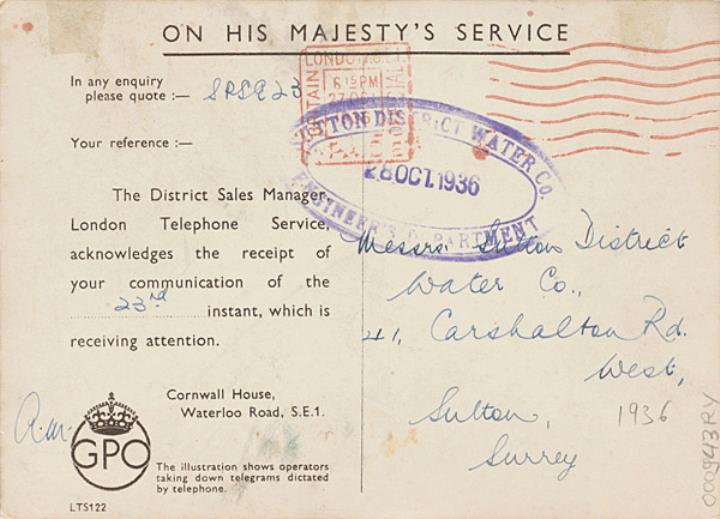 Illustrierte Postkarte; Fotografie, monochrom Rückseite: Büroansicht; weibliche/männliche Mitarbeiter mit Kopfhörer und Schreibmaschine bei der Niederschrift telefonischer Telegramme Vorderseite mit vorgedrucktem Text; adressiert; Freistempel London/27 Oct 1936