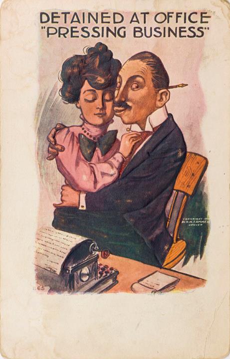 Illustrierte Postkarte; Grafik, polychrom Nr. 865, copyright 190x H. H. Tammen Rückseite: Mitarbeiter/Vorgesetzter und Sekretärin mit Schreibmaschine in romantischer Büroszene Vorderseite nicht beschrieben