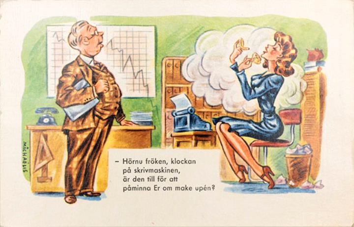 Illustrierte Postkarte; Grafik, polychrom Vorderseite: Büroszene; Vorgesetzter und Sekretärin mit Schreibmaschine, sich das Gesicht pudernd Rückseite nicht beschrieben