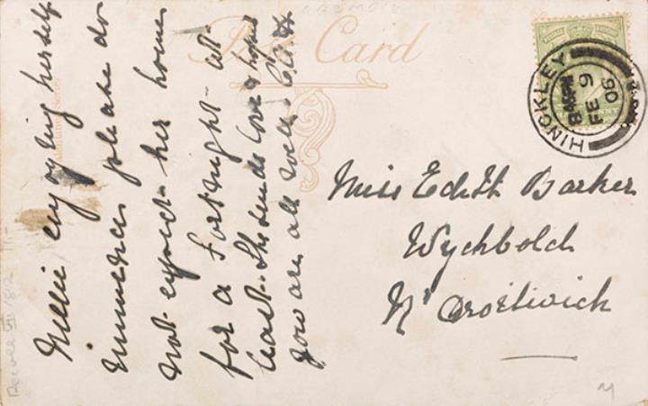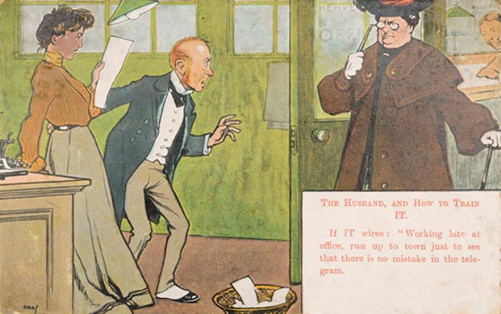 Illustrierte Postkarte; Grafik, polychrom; Valentine's Series Rückseite: Büroszene; Vorgesetzter und Sekretärin mit Schreibmaschine, Ehefrau betritt den Raum, Text in Kartusche Vorderseite: beschrieben; adressiert an Miss Barker, Droitwich; Briefmarke Postage Revenue (U.K.) Half Penny; Poststempel Hinckley/Fe 9 1906
