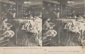 Illustrierte Postkarte; Stereofotografie, monochrom Rückseite: Arbeiterinnen im Vorratslager der London Corset Co., im Vordergrund Mädchen mit Schreibmaschine Vorderseite mit Vermerk: c. 1898