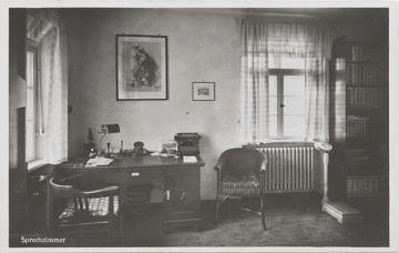 Illustrierte Postkarte; Fotografie, monochrom; Nr. 3278-5 Rückseite: Arbeitszimmer mit Schreibmaschine Rheinmetall Vorderseite mit Vermerk: Städt. Kneippbad Beineck