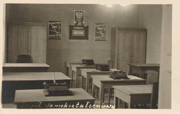 Illustrierte Postkarte; Fotografie, monochrom Rückseite: Übungsraum mit Schreibmaschine Vorderseite: mit Stempel; nicht beschrieben