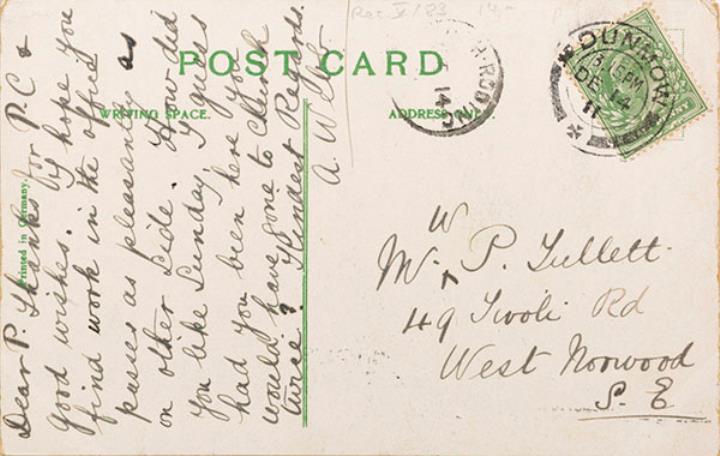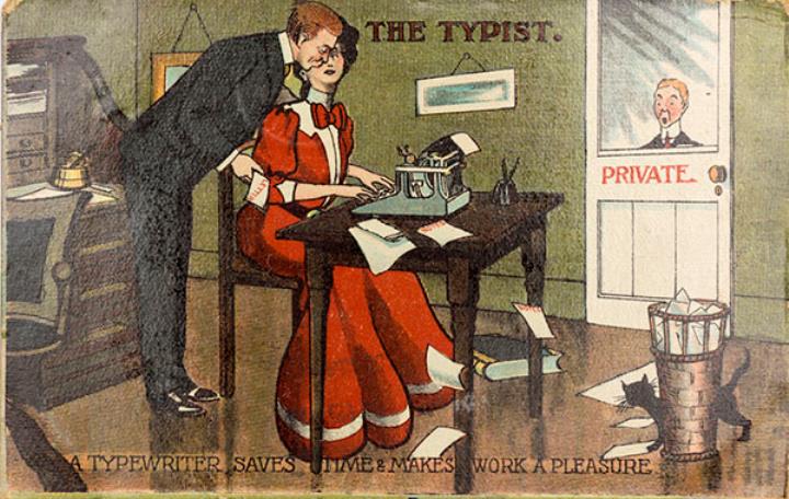 Illustrierte Postkarte; Grafik, polychrom Rückseite: Vorgesetzter und Sekretärin mit Schreibmaschine in romantischer Büroszene, Bürojunge am Türfenster Vorderseite: beschrieben, adressiert an M. Sullett, West Norwood; Briefmarke Postage Revenue (U.K.) Half Penny; Poststempel Dunmow/De 14 1911