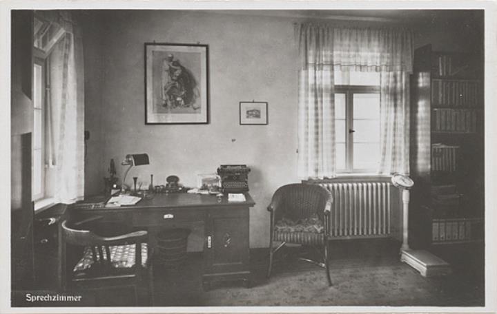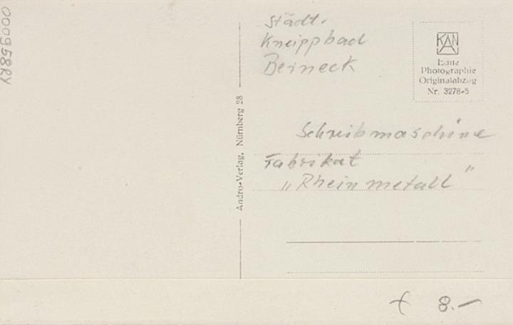 Illustrierte Postkarte; Fotografie, monochrom; Nr. 3278-5 Rückseite: Arbeitszimmer mit Schreibmaschine Rheinmetall Vorderseite mit Vermerk: Städt. Kneippbad Beineck