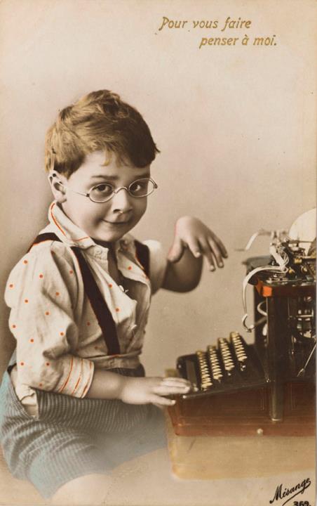 Illustrierte Postkarte; Fotografie, koloriert; Serie Mésange 369 Rückseite: Junge mit Brille und Schreibmaschine, Blick zum Betrachter Vorderseite nicht beschrieben