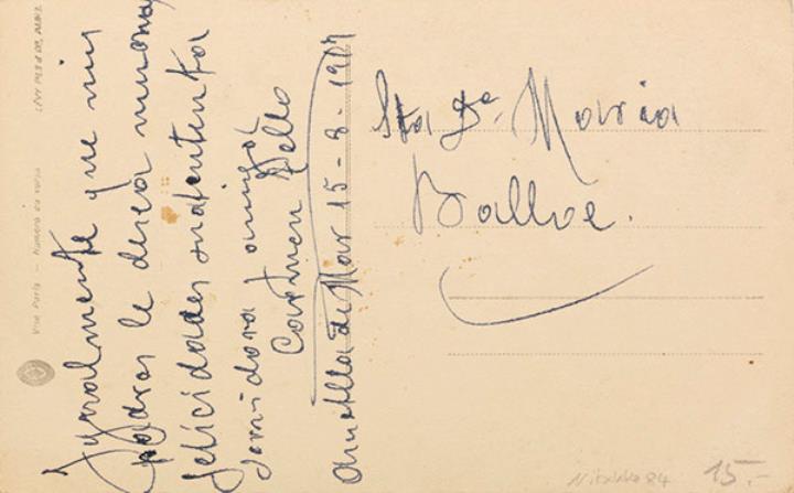 Illustrierte Postkarte; Fotografie, koloriert; Serie Mésange 369 Rückseite: Junge mit Brille und Schreibmaschine Vorderseite beschrieben