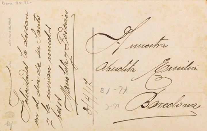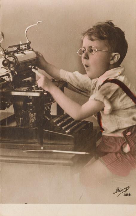 Illustrierte Postkarte; Fotografie, koloriert; Serie Mésange 369 Rückseite: Junge mit Brille und Schreibmaschine Vorderseite beschrieben und adressiert