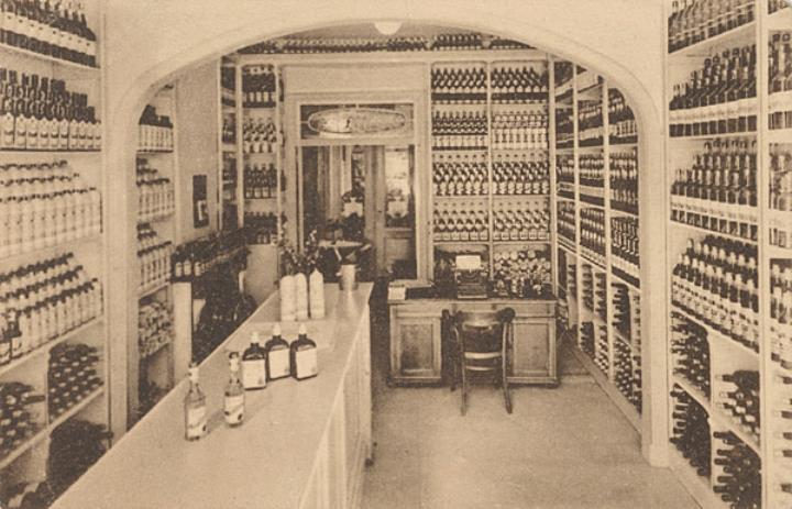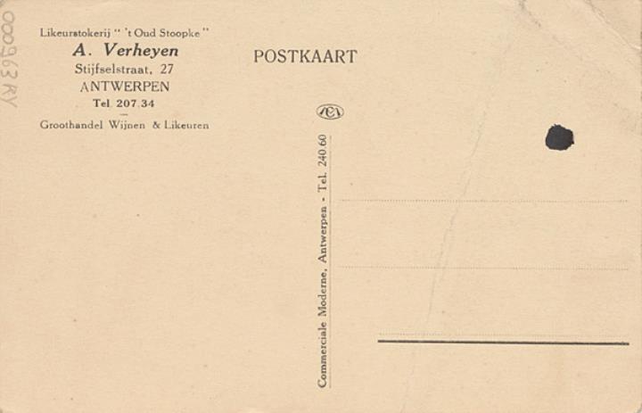 Illustrierte Postkarte; Fotografie, monochrom Rückseite: Innenansicht einer Spirituosenhandlung; Tisch mit Schreibmaschine Vorderseite mit Berschreibungstext: Likeurstokerij A. Verheyen, Antwerpen