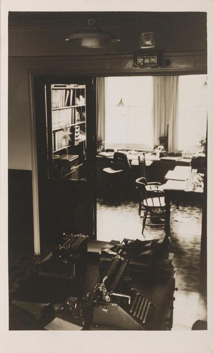 Illustrierte Postkarte; Fotografie, monochrom Rückseite: Ansicht zweier Bürozimmer; im Vordergrund Tisch mit Schreibmaschinen (fünfreihige Tastatur) Vorderseite nicht beschrieben