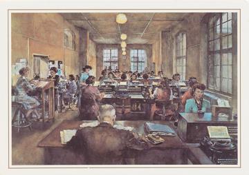 Illustrierte Postkarte; Nachdruck eines Gemäldes, polychrom Rückseite: Büro für Telegrammaufnahme; Mitarbeiterinnen mit Kopfhöhrer und Schreibmaschine Vorderseite mit Beschreibungstext