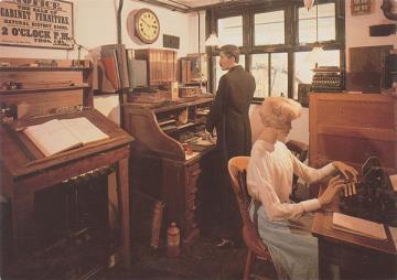 Illustrierte Postkarte; Fotografie, polychrom Rückseite: Diorama aus dem Tudor House Museum, Worcester; Büroszene aus der Zeit um 1920 Vorderseite: beschrieben, adressiert; Briefmarke Royal Mail 26P; Poststempel Hull/18 Mch 199x