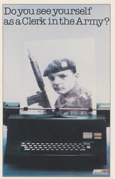 Werbepostkarte; Nachdruck eines Plakats (British Army Recruitment Poster, 1989), polychrom Rückseite: Schreibmaschine mit eingespanntem Papierbogen, auf dem ein Soldat abgebildet ist Vorderseite nicht beschrieben