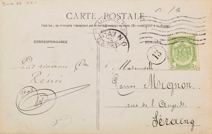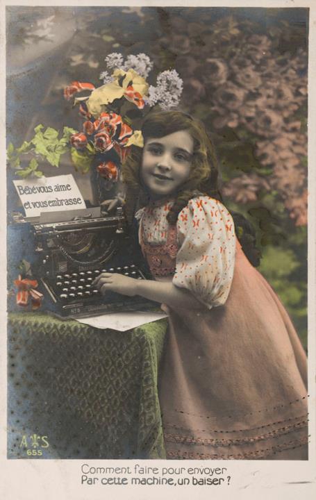 Illustrierte Postkarte; Fotografie, koloriert; Serie A S 655 Rückseite: Mädchen mit Schreibmaschine, Blick zum Betrachter, Blumen als Dekoration, Text in Versform Vorderseite: beschrieben; adressiert an Mademoiselle Mignon, Seraign; Briefmarke Postes Belgique 5c; Poststempel Bruxelles/15 Mai 1908