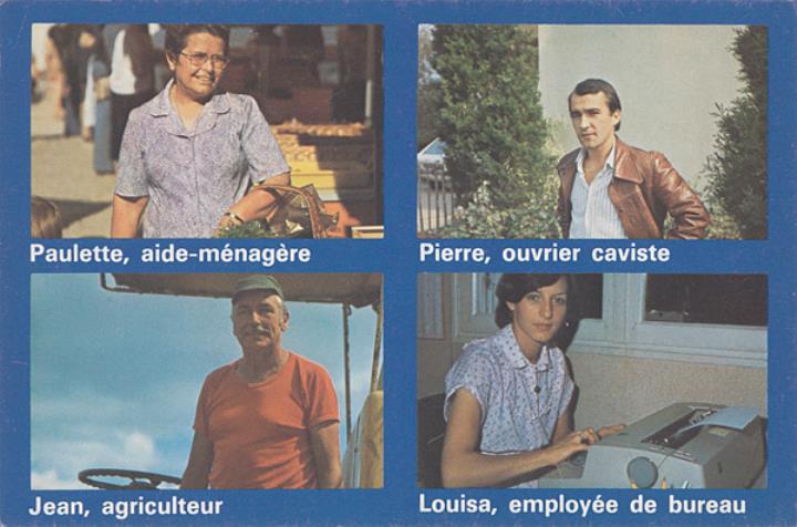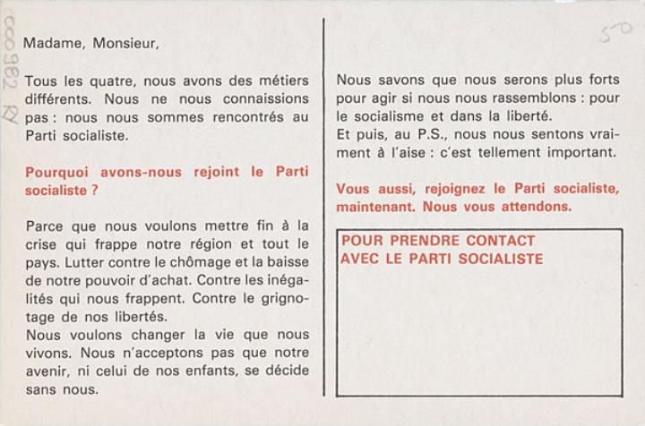Werbepostkarte; Fotocollage, polychrom Rückseite: vier Kleinansichten von berufstätigen Frauen/Männern Vorderseite mit Werbetext (Sozialistische Partei Frankreich)