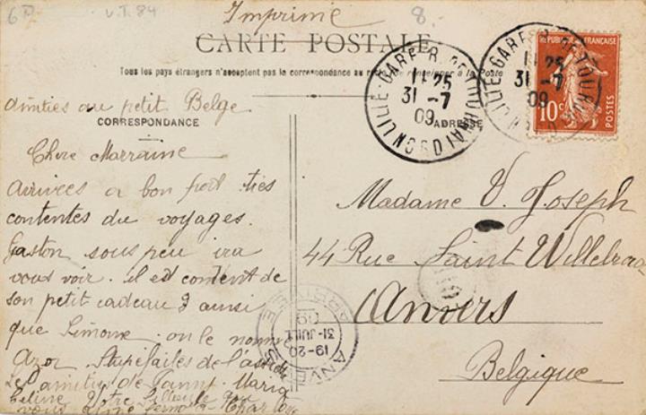 Illustrierte Postkarte; Fotografie, koloriert; Serie A S 655 Rückseite: Mädchen mit Schreibmaschine, Blick zum Betrachter, Blumen als Dekoration, Text in Versform Vorderseite: beschrieben; adressiert an Madame Joseph, Anvers; Briefmarke Postes Francaises 10c; Poststempel Tournai/Anvers/31.07.1909