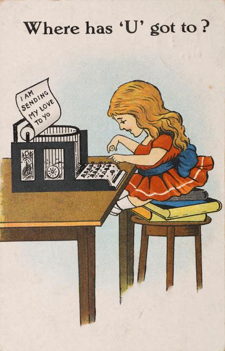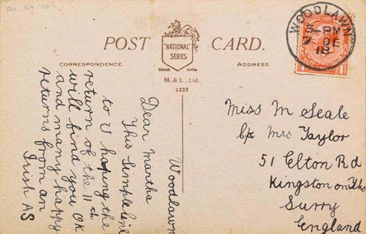 Illustrierte Postkarte; Grafik, polychrom; Nr. 1223 Rückseite: Mädchen mit Schreibmaschine Vorderseite: beschrieben; adressiert an Miss Seale, Surrey; Briefmarke Postage Revenue (U.K.) One Penny; Poststempel Woodlawn/7 De 1918