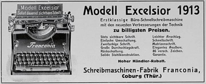 Werbeanzeige für Schreibmaschine Franconia Excelsior monochrom